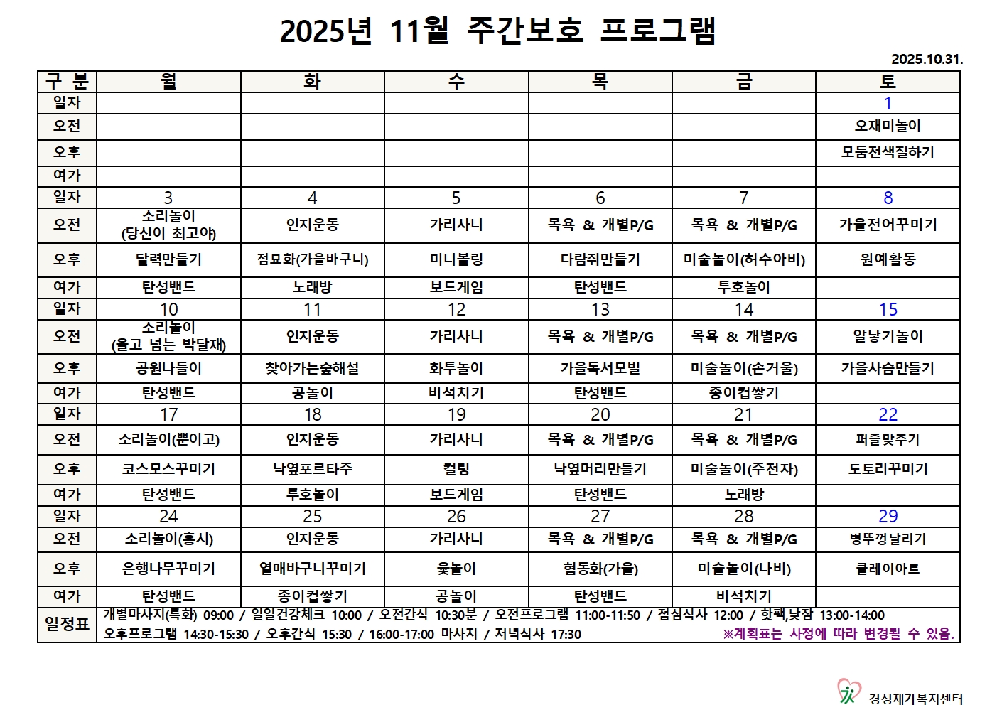 25년 11월 프로그램계획표