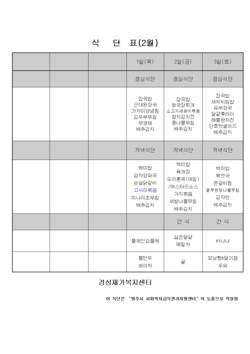 24년 2월 식단표