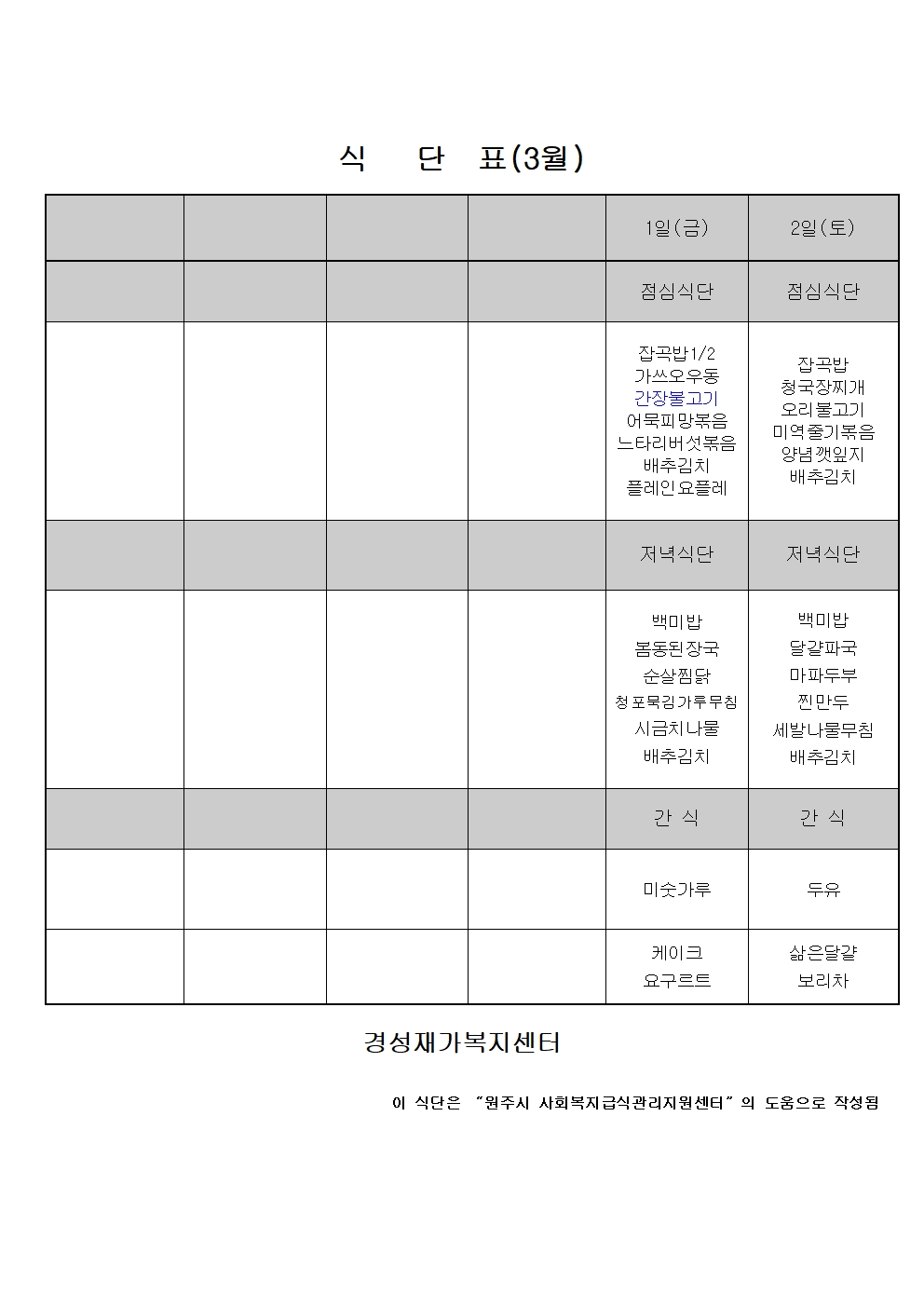 24년 3월 식단표