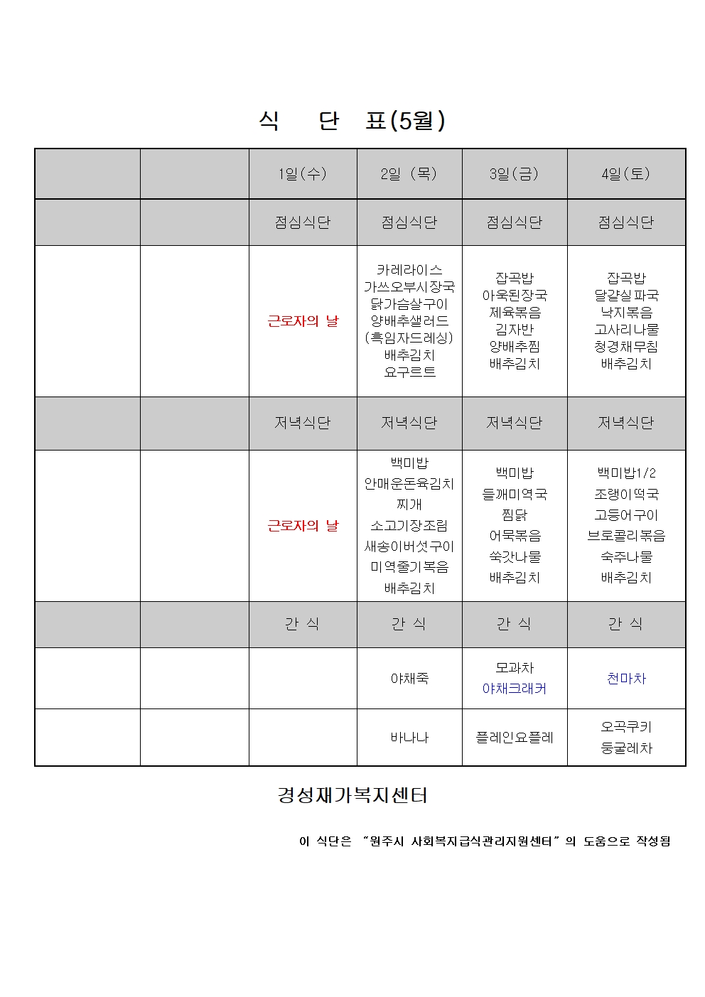 24년 5월 식단표