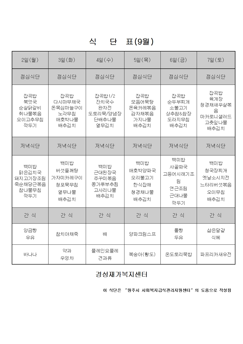 24년 9월 식단표