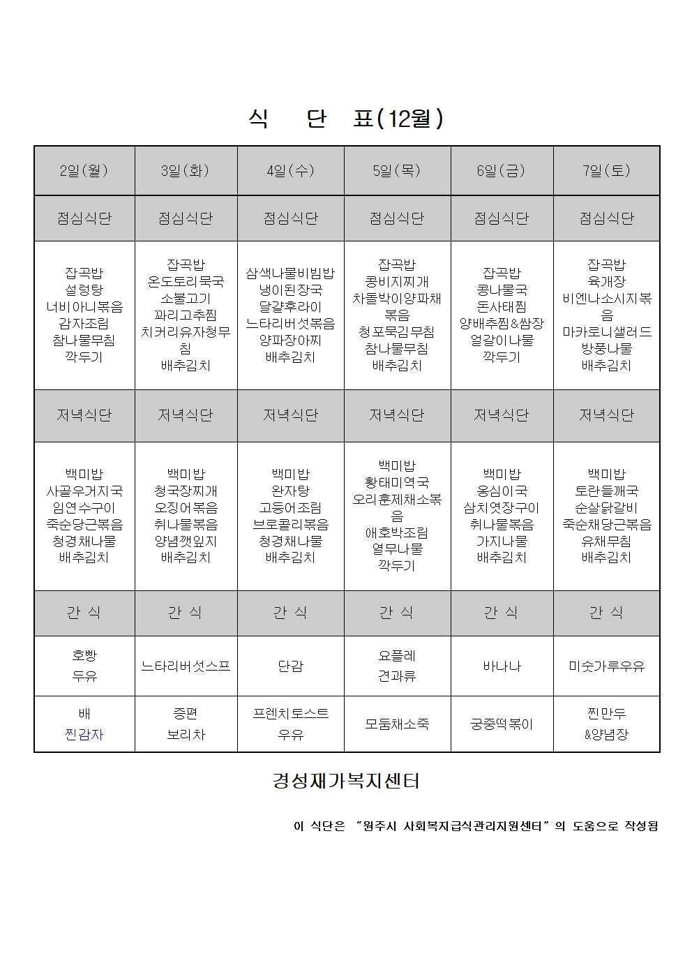 기관에서 직접 조리한 식사와 간식이 제공됩니다.