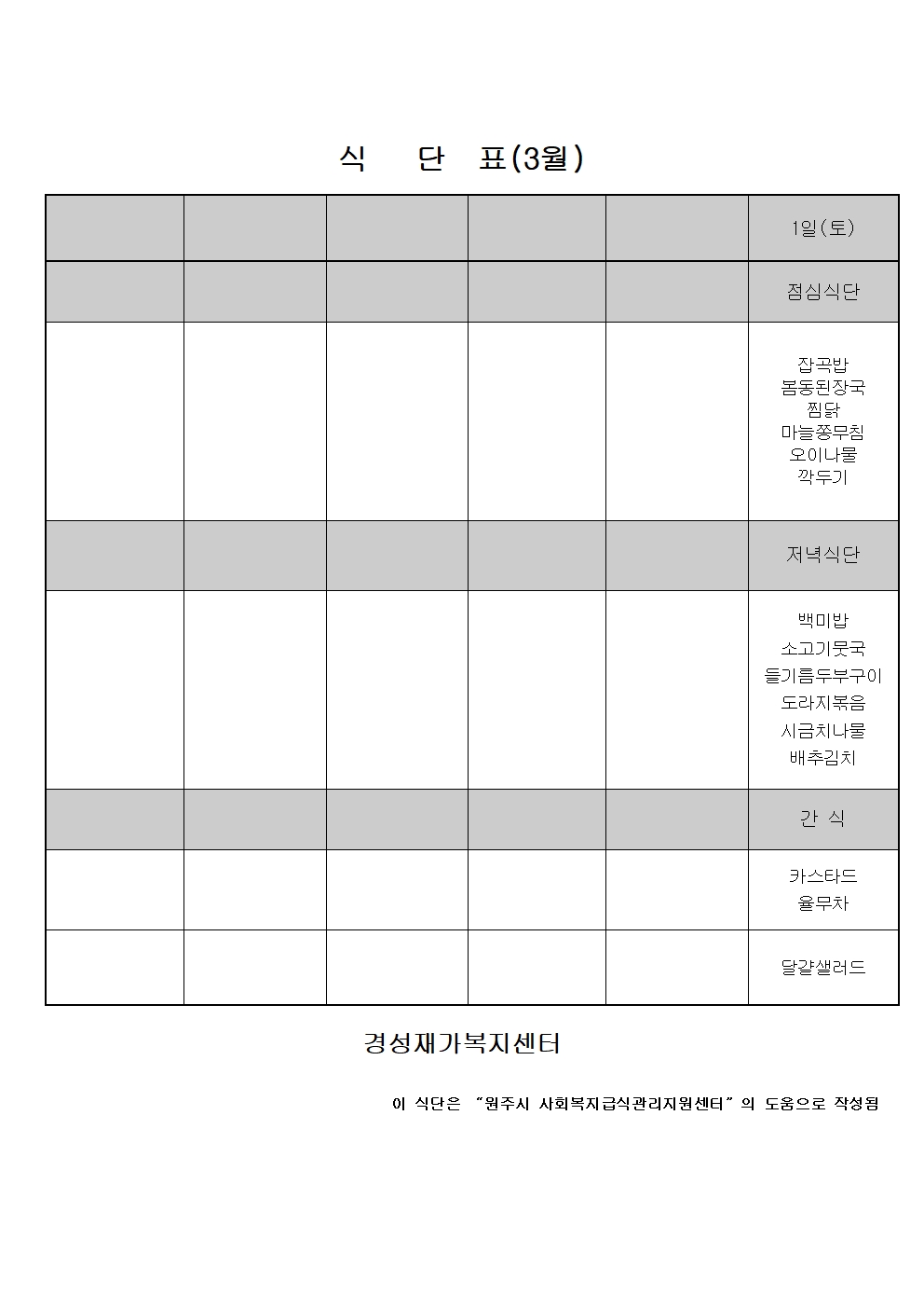 25년 3월 식단표