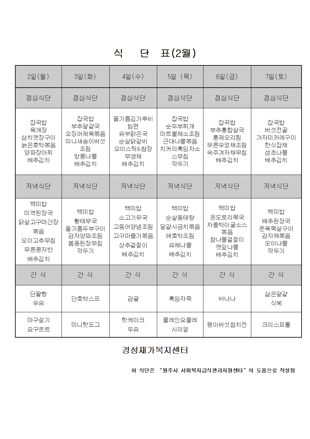 26년 2월 식단표